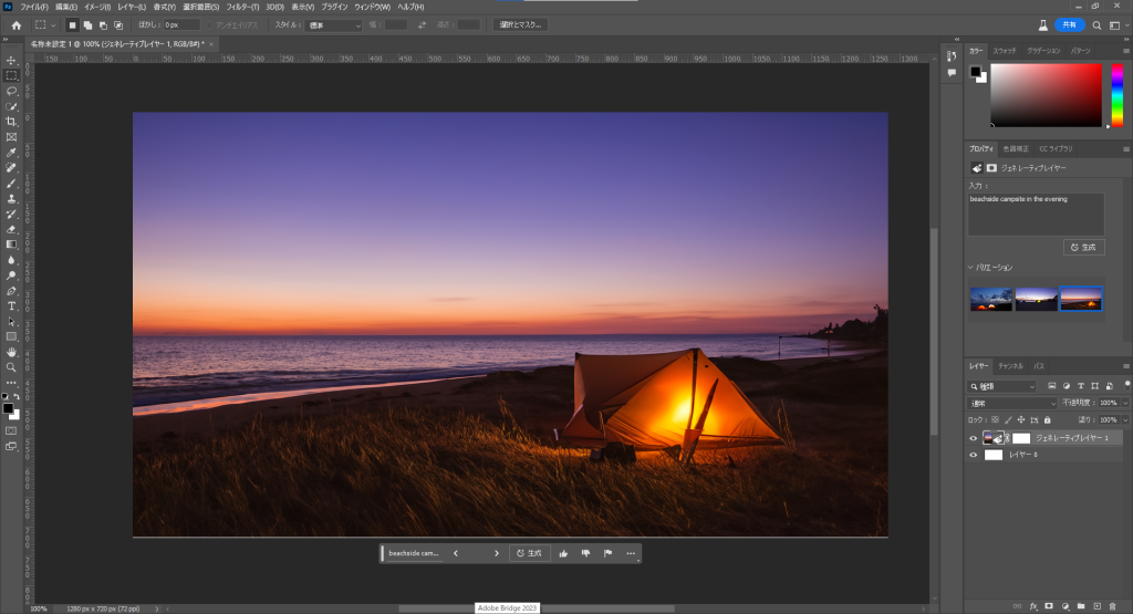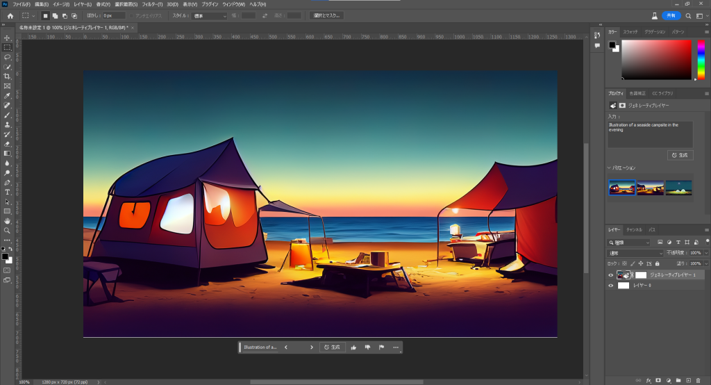 プロンプトに「beachside campsite in the evening」と入力し、生成をクリック。