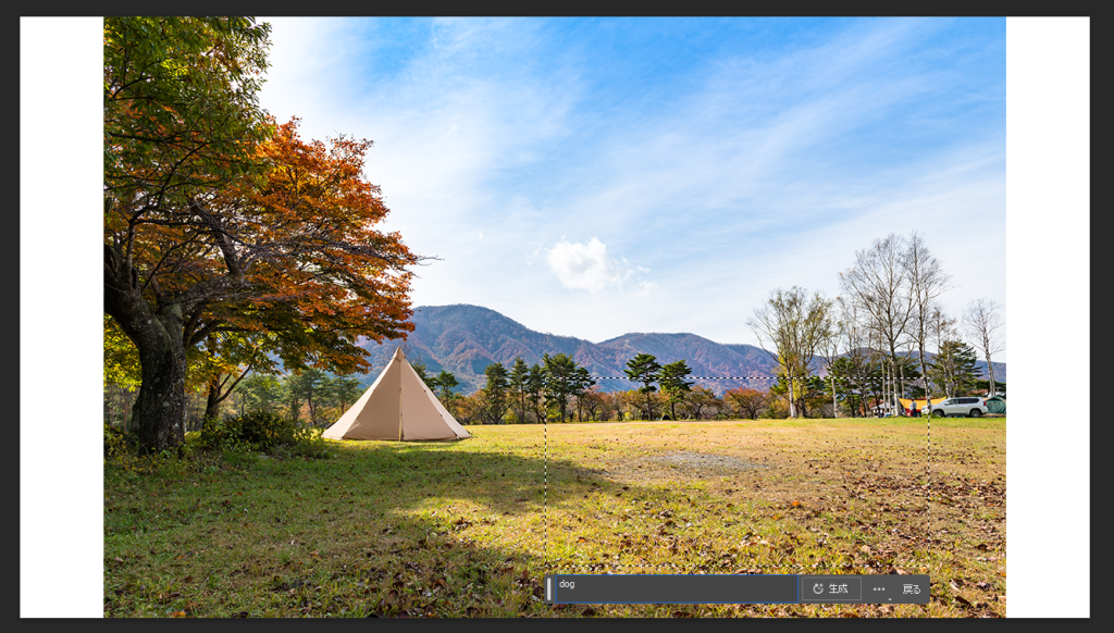 プロンプトに、「dog playing in camp」と入力し、生成をクリック。↓