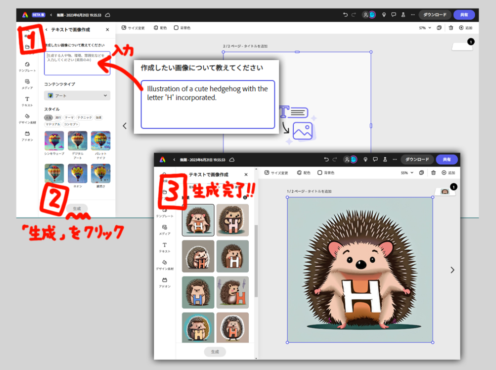 現在は、日本語プロンプトの入力も可能になっているので、この工程は不要です。 - Adobe Expressの生成AIに翻訳した指示文を入力して生成!