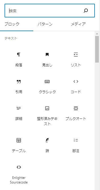 プラグインを有効化すると、投稿編集ページの「ブロック」の選択肢に、「Enlighter Sourcecode」が出現します。