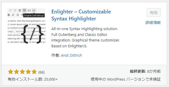 プラグイン「Enlighter – Customizable Syntax Highlighter」をインストール。